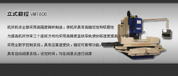 立式數(shù)控VM1806銑床是我公司根據(jù)制造業(yè)的市場需求,自行研制和開發(fā)的新型數(shù)控立式銑床,它采用模塊式設(shè)計,除具備立式銑床的功能外可加側(cè)銑頭,實現(xiàn)臥式鏜銑功能,還可加裝刀庫使加工范圍和功能進(jìn)一步擴大,適合于航空、航天工業(yè)復(fù)雜結(jié)構(gòu)件、試驗件的型面加工,也適合汽車模具和零備件和制造。